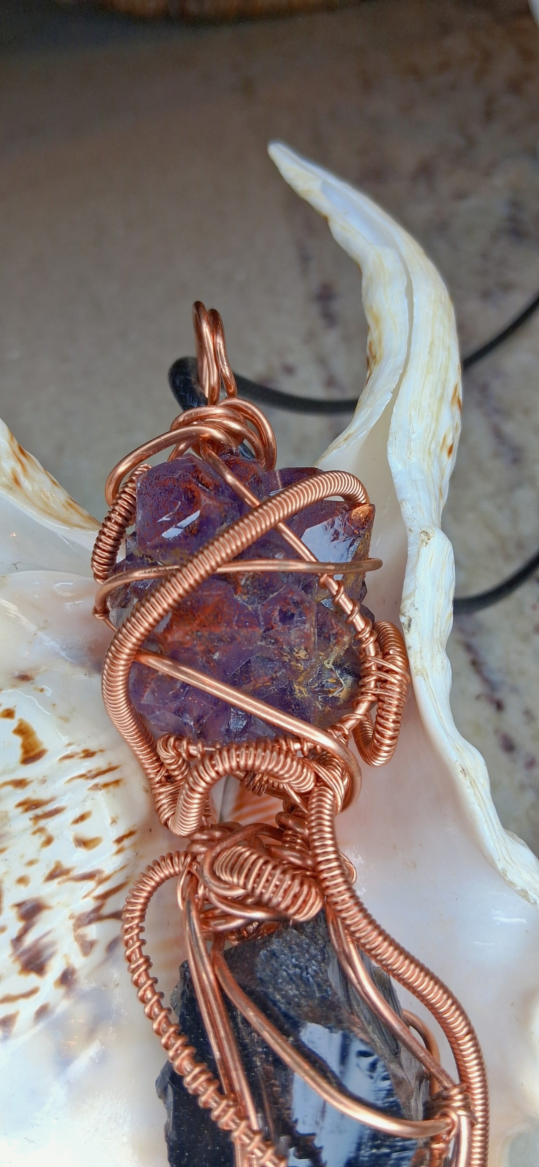 This handmade wire-wrapped copper combination pendant features Auralite-23 at the top and Black Obsidian at the bottom, intentionally wrapped together as one powerful piece.